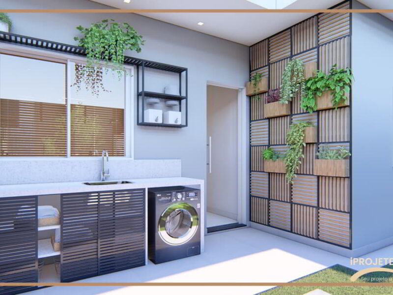 A garagem coberta para dois carros garante praticidade no acesso e segurança. A lavanderia, bem posicionada, facilita o dia a dia sem interferir nas áreas sociais. A casa de gás, projetada para um botijão, e a caixa d’água de 1.000 litros atendem plenamente às demandas da residência, proporcionando autonomia e segurança.