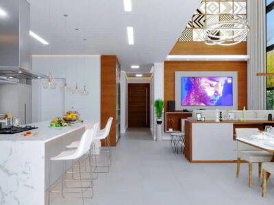 Logo ao adentrar a casa, os moradores são recebidos por ambientes integrados, criando uma sensação de amplitude e fluidez. A sala de estar, jantar e cozinha se conectam de maneira harmônica, oferecendo um espaço perfeito para convívio familiar. Essa integração também garante uma excelente ventilação e iluminação natural, criando um ambiente acolhedor e confortável para o dia a dia.