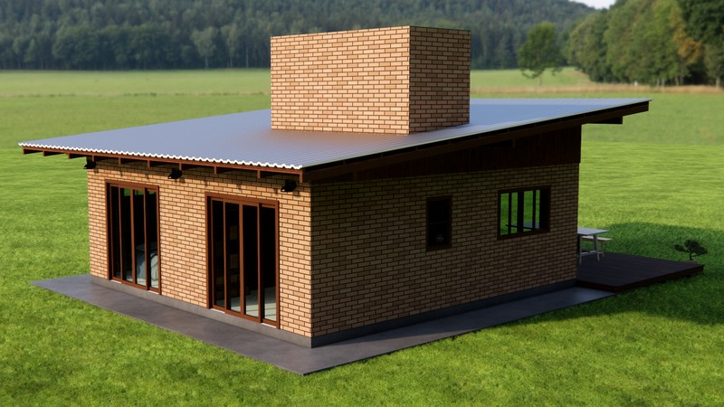 Os materiais sustentáveis utilizados em sua construção garantem tanto a economia quanto o conforto térmico e acústico. As paredes de tijolos modulares de solocimento, conhecidos por sua eficiência energética, ajudam a regular a temperatura interna da casa, enquanto as telhas metálicas termoacústicas garantem uma melhor isolação térmica. O telhado de uma água, com inclinação de 10%, é outro ponto de destaque, oferecendo um pé direito variável que cria uma sensação de amplitude e agrega elegância ao interior.