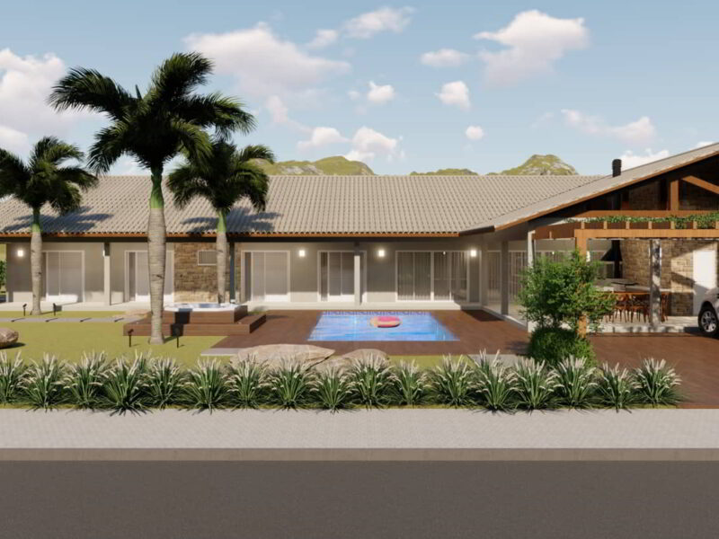 A garagem, com capacidade para até 3 veículos, é coberta por um pergolado, agregando estética e funcionalidade ao projeto. Em resumo, a planta de casa 61 oferece uma residência que combina conforto, lazer e praticidade, tudo em harmonia com a natureza e o ambiente ao redor.