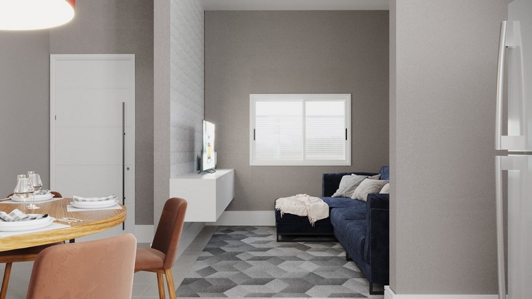 A Residência Guatemala adota um estilo moderno, destacando-se pela sua decoração clean que confere elegância e refinamento ao ambiente. Apesar de sua planta compacta, a casa atende de forma eficiente às necessidades básicas do futuro morador. A paleta de cores claras e as linhas retas contribuem para criar uma atmosfera aconchegante e tornam o espaço mais leve.