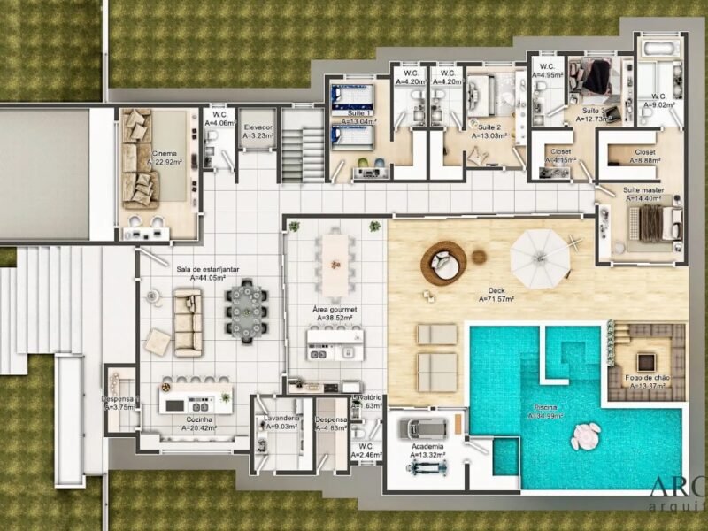 A área de lazer da Casa Montreal é verdadeiramente excepcional. A piscina de 34.99m², sauna, hidromassagem e fogo de chão de 13.37m² criam um ambiente descontraído e relaxante para todos os moradores. A área gourmet, com 38.52m², é sofisticada, rústica e minimalista, com fechamento em vidro para uma integração perfeita dos espaços externos. A academia privativa complementa a experiência de bem-estar proporcionada pela casa, criando um ambiente ideal para quem valoriza saúde e conforto.