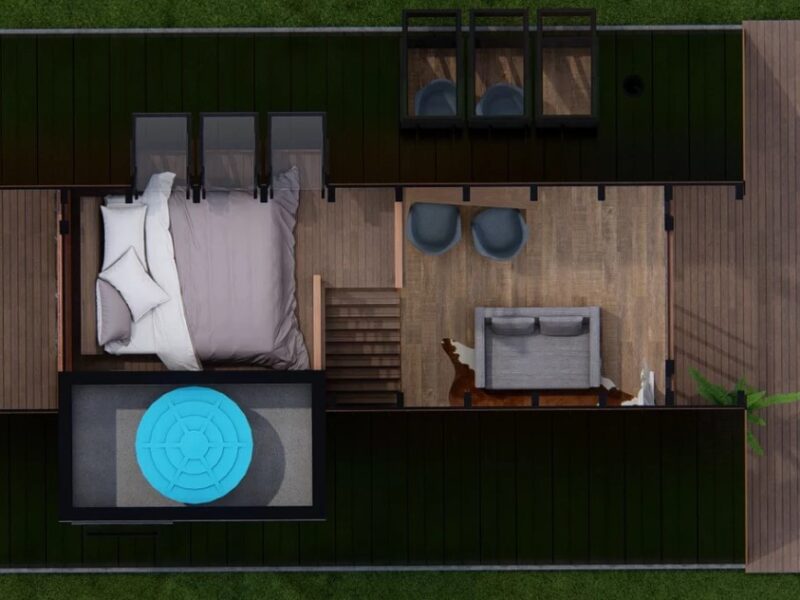No pavimento térreo, o Chalé Alpino se destaca pela integração dos ambientes, onde a cozinha, a sala de estar e a sala de jantar formam um espaço fluído e versátil. O design inteligente conecta esses ambientes a dois decks externos, estrategicamente posicionados para aproveitar ao máximo as áreas ao ar livre e a natureza ao redor. O banheiro no térreo oferece praticidade, sem perder a estética acolhedora do chalé.