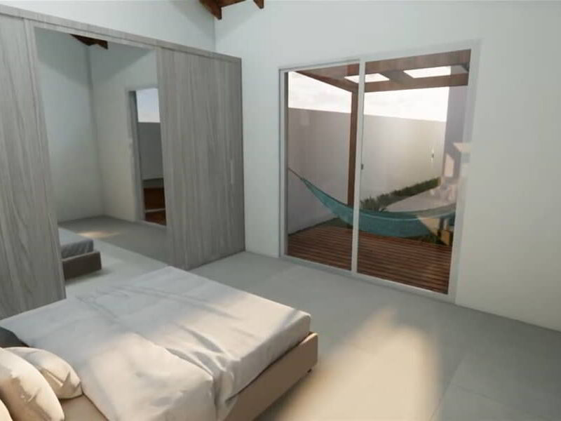 Além disso, há uma circulação inteligente que acomoda a máquina de lavar e dá acesso ao quarto de 13,80 m². O quarto possui uma porta-janelão, permitindo ventilação natural e uma conexão visual com o exterior. O projeto também inclui um banheiro de 4,20 m², funcional e bem planejado.