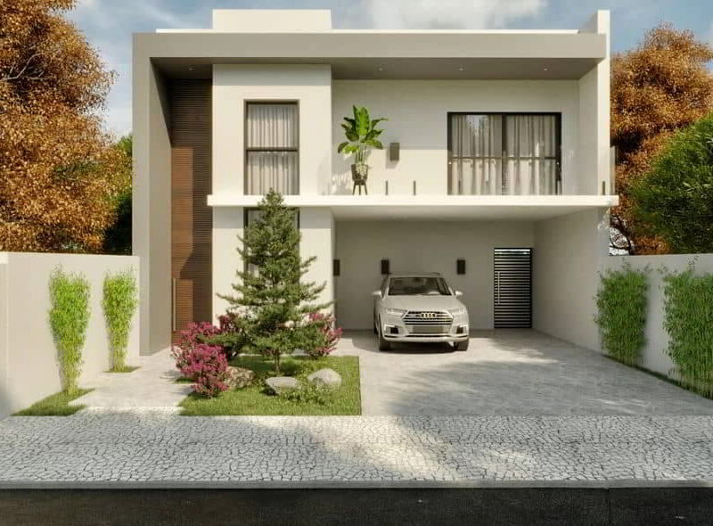 O pé direito duplo na sala é o principal atrativo do projeto, conferindo um ambiente amplo e arejado, ideal para quem aprecia espaços altos e bem iluminados. A fachada moderna aproveita ao máximo a largura do terreno, com uma composição que garante harmonia estética e funcionalidade.