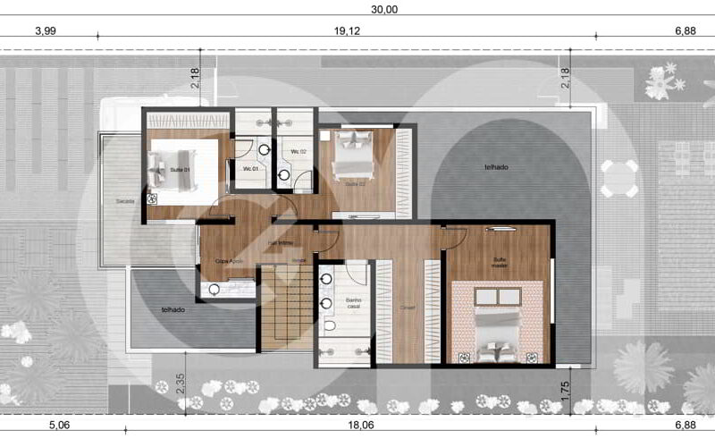 No pavimento superior, o Projeto Bella oferece três suítes, sendo uma delas uma suíte master com closet. O layout das suítes foi cuidadosamente planejado para proporcionar privacidade e conforto, com amplos espaços e acabamentos de alta qualidade. Cada suíte é acompanhada por um banheiro moderno e funcional, projetado para ser ao mesmo tempo esteticamente agradável e prático.
