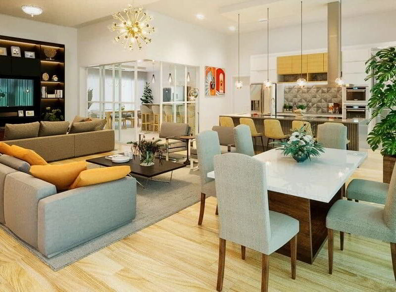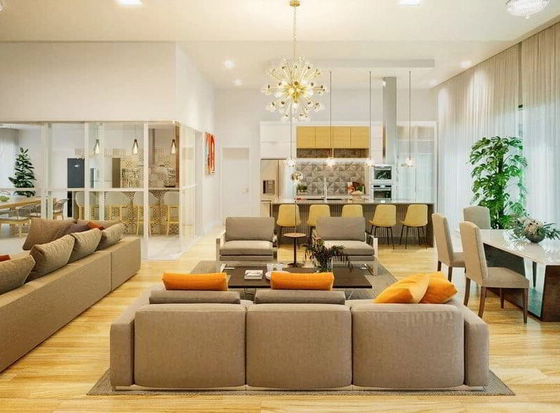 - Área Social: O coração da casa, composta por uma sala de estar espaçosa, ideal para relaxamento e convivência. A cozinha gourmet, totalmente equipada e integrada à sala de estar, é perfeita para quem gosta de receber amigos e familiares com estilo. O jardim de inverno na área interna também garante um ambiente leve e agradável, aumentando a luminosidade e ventilação.