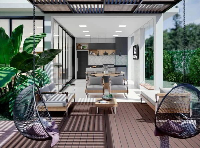 A área gourmet é integrada à cozinha, seguindo a mesma linha de design moderno e sofisticado, e se conecta ao deck com pergolado em frente à piscina. Esta área ao ar livre será um local perfeito para momentos de lazer e convívio social. O projeto ainda oferece um outro espaço de descanso cercado por verde, criando um ambiente tranquilo e natural.