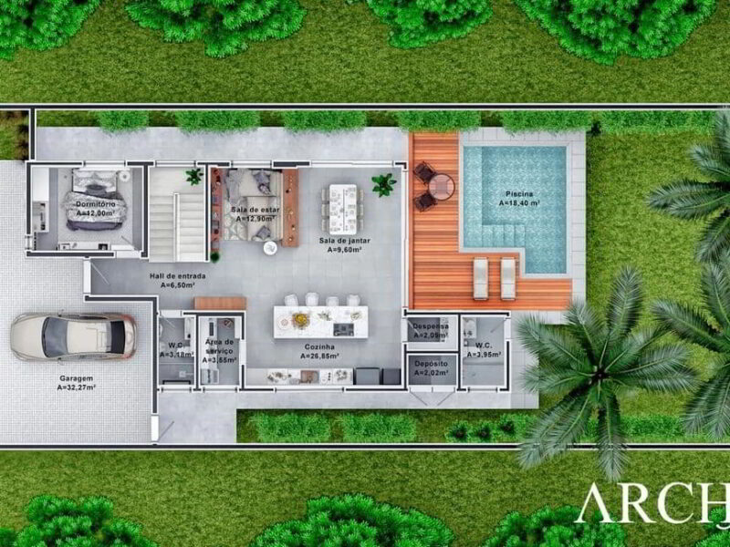 O Projeto Milão é ideal para quem busca uma casa moderna e funcional, com 4 quartos, piscina e área gourmet. A planta foi pensada para integrar os espaços de forma harmônica, oferecendo ambientes amplos, bem iluminados e confortáveis. A área de lazer, com piscina e jardim, garante momentos inesquecíveis com a família. Além disso, o quarto de hóspedes e o closet na suíte master são detalhes que agregam ainda mais ao projeto, tornando-o perfeito para quem deseja um lar sofisticado e prático.