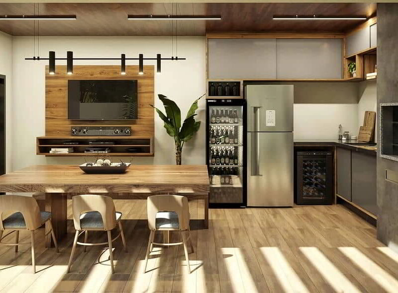 A área gourmet do Projeto Munique é um dos grandes destaques. Com acesso direto pela cozinha, ela integra-se perfeitamente com os demais ambientes sociais, criando um espaço fluido e aberto para receber convidados sem perder a intimidade. O lavabo ao lado da área gourmet complementa o design, oferecendo um ambiente sofisticado e prático.