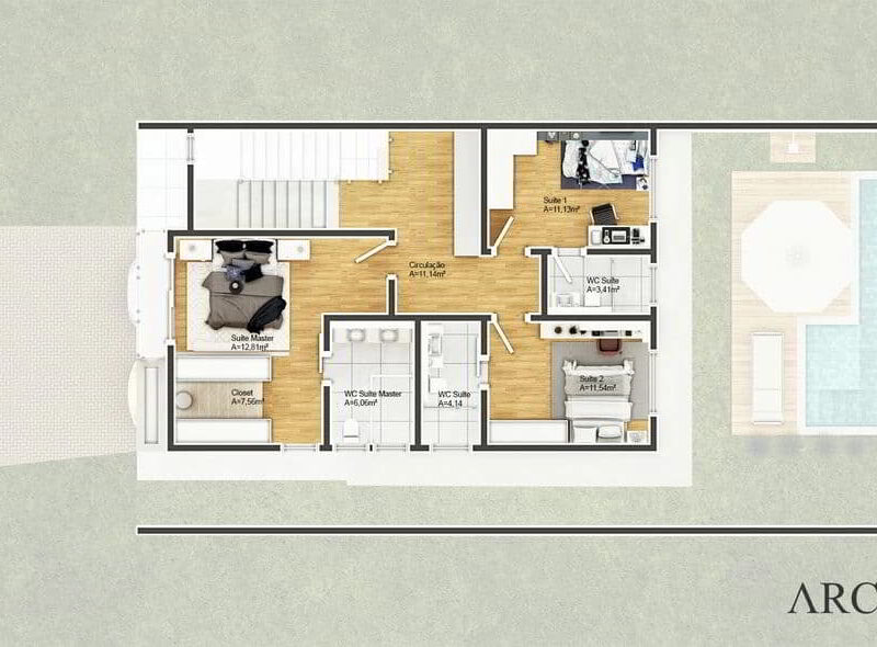 As 3 suítes são o coração da casa, com espaços generosos, closets amplos e banheiros luxuosos. Cada suíte foi pensada para proporcionar um ambiente de conforto e privacidade, oferecendo um refúgio tranquilo para toda a família. O design interno dessas suítes combina sofisticação com funcionalidade, garantindo o máximo aproveitamento de espaço.