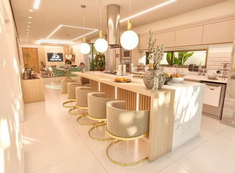 A cozinha gourmet, equipada com eletrodomésticos modernos e amplos armários planejados, é o coração da casa. Aqui, preparar refeições se torna um prazer, enquanto a ilha central oferece um espaço para reunir-se e conversar. A integração com a área de estar permite que o cozinheiro participe das conversas, tornando o momento da refeição ainda mais especial.