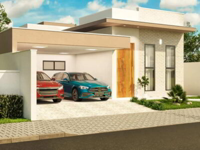 - Fachada Moderna: A fachada do sobrado mistura linhas retas e acabamentos contemporâneos, com uma porta de entrada imponente e grandes janelas que garantem iluminação natural abundante.