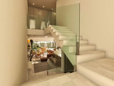 Ao entrar na casa, somos recebidos por uma chapearia que conecta o interior à natureza ao redor, proporcionando uma visão ampla para a cozinha, a sala de jantar e a área gourmet. Este design aberto e luminoso traz uma sensação de amplitude, criando um ambiente agradável e fluido. A sala de estar, luxuosa e iluminada pelas grandes janelas, oferece acesso ao segundo pavimento por uma escada monumental, que é um dos grandes destaques do projeto.