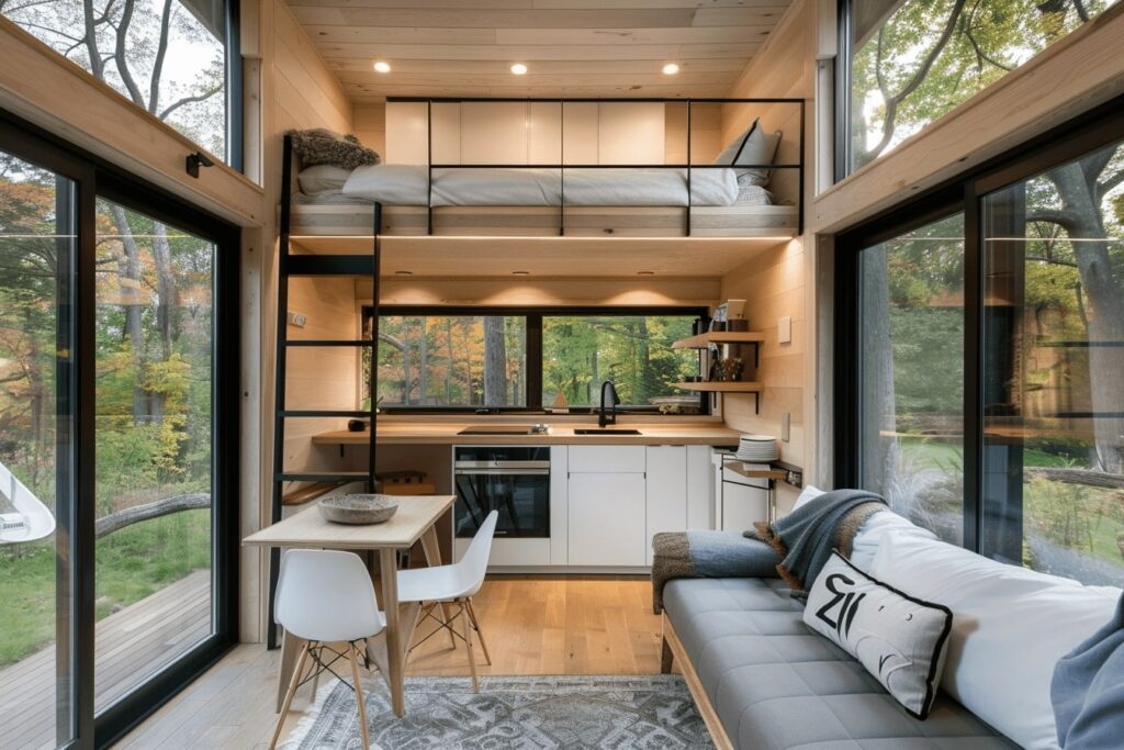 Muitas Tiny Houses optam por espaços abertos e integrados, como uma cozinha que se conecta diretamente à sala de estar, para criar uma sensação de amplitude e conforto.